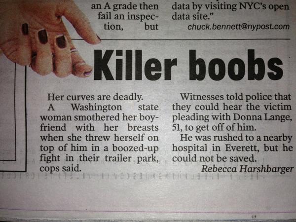 I don’t write the news.I just tweet them.Talk about killer boobs.Woman allegedly smothers boyfriend with breasts soc.li/I0EUvLK
